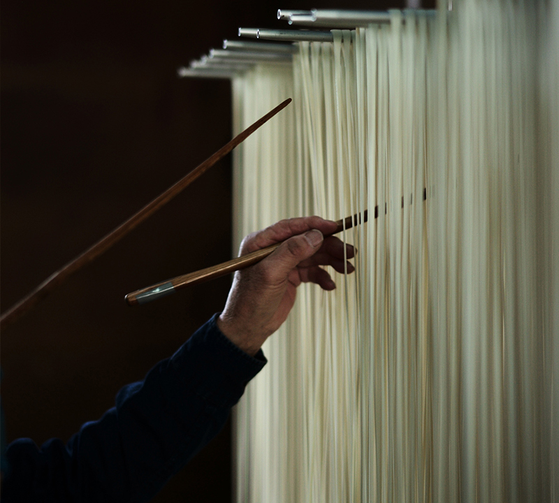 半田そうめんといえば特徴的な「太い麺」。麺の太さで区分すると、「ひやむぎ」に分類されるのですが、半田手延べそうめんの場合、伝統と麺文化の地域性が認められ、特別に「そうめん」と表記できることとなっています。太い麺からうまれる独特の麺のコシが人気の理由です。
